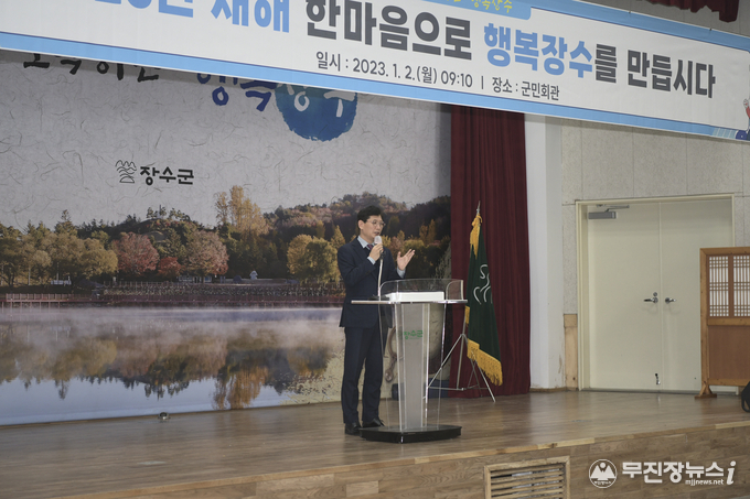 최훈식 군수는 신년사를 통해 “민선8기의 실질적인 원년인 2023년에는 그동안 쌓아올린 탄탄한 기반을 바탕으로 군민들게 약속드렸던 사업들을 신속하고 차질없이 추진해 나가겠다”며 “‘모든 사람이 한마음 한뜻으로 노력한다’라는 동심동덕의 자세로 군민과 공직자 모두가 화합해 행복장수를 만들어나가자”고 말했다.