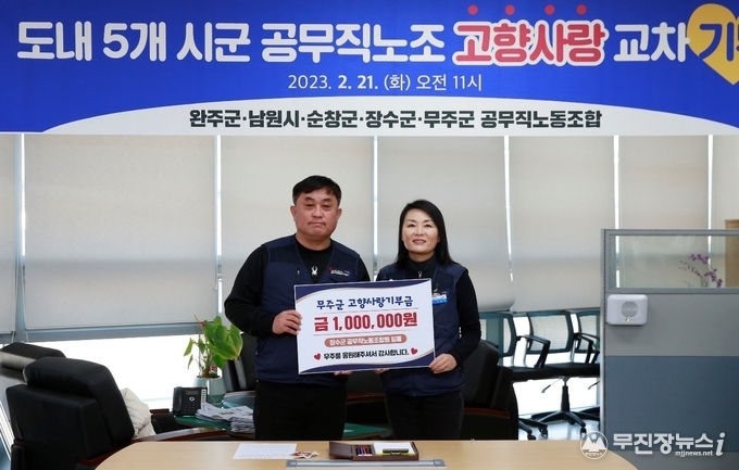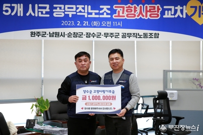 고향사랑기부제가 시행된 지 50여 일이 지난 가운데 장수군을 비롯한 도내 5개 시군 공무직노동조합이 고향사랑기부제를 활성화하기 위해 21일 지자체 간 교차 기부를 진행했다.