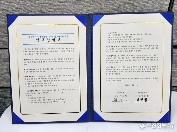 장수군이 지역의 우수 농특산물의 판촉 및 통합마케팅 활성화를 위해 지난 27일 장수우체국과 온라인 판매촉진 협약을 맺었다고 밝혔다.협약에 따라 장수군과 장수우체국은 지역 농특산물의 판로 확대 및 마케팅 강화를 위한 상호 협력관계를 형성하고 28일부터는 후지사과 소비 촉진을 위한 온라인 프로모션을 진행하기로 했다.