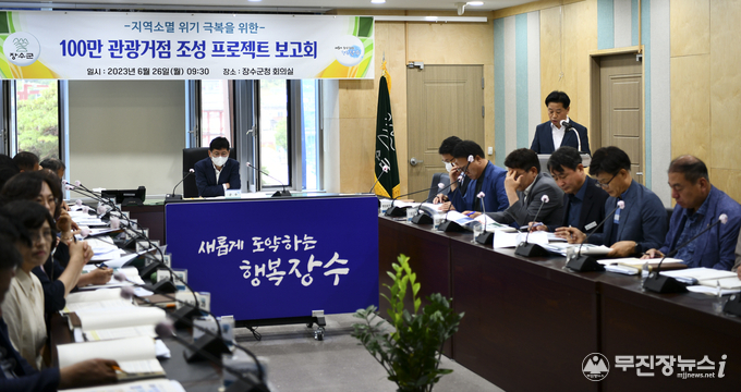 군은 26일 최훈식 장수군수 주재로 ‘지방소멸 위기 극복을 위한 100만 관광거점 조성 프로젝트’ 보고회를 개최했으며, 이종훈 장수군 부군수가 직접 발표했다.