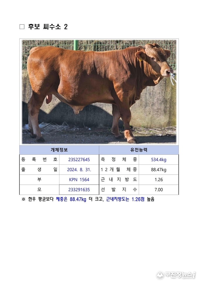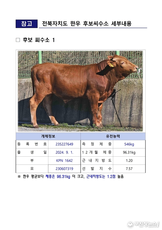 선발된 후보씨수소는 한우 평균 대비 체중이 최대 96kg, 근내지방도가 1.26점 높아 빠른 성장과 우수한 육질을 겸비했다. 이는 전북도가 추진 중인 ‘저탄소 한우 육성 정책’과도 맞닿아 단기 사육을 통한 탄소중립 실현에 크게 기여할 것으로 기대된다.