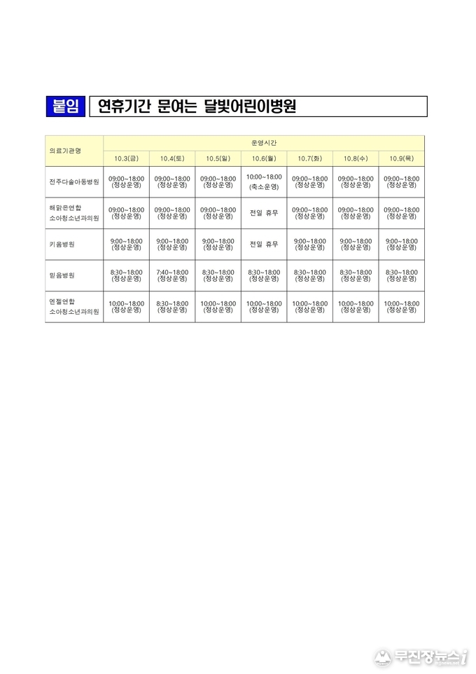 특히, 소아 응급환자가 연휴기간에도 안심하고 진료받을 수 있도록 예수병원 소아전문응급의료센터는 24시간 운영한다. 또한 달빛어린이병원과 원광대학교병원 권역응급의료센터 소아진료실도 정상 운영되어, 아이들이 밤낮없이 안전하게 진료받을 수 있도록 지원한다.