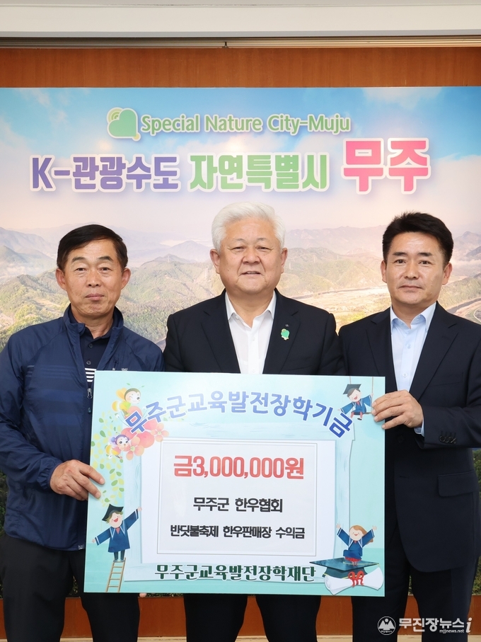 무주군 한우협회 회원들이 지난 1일 무주군교육발전장학재단(이사장 무주군수 황인홍)에 장학금 3백만 원을 기탁했다.