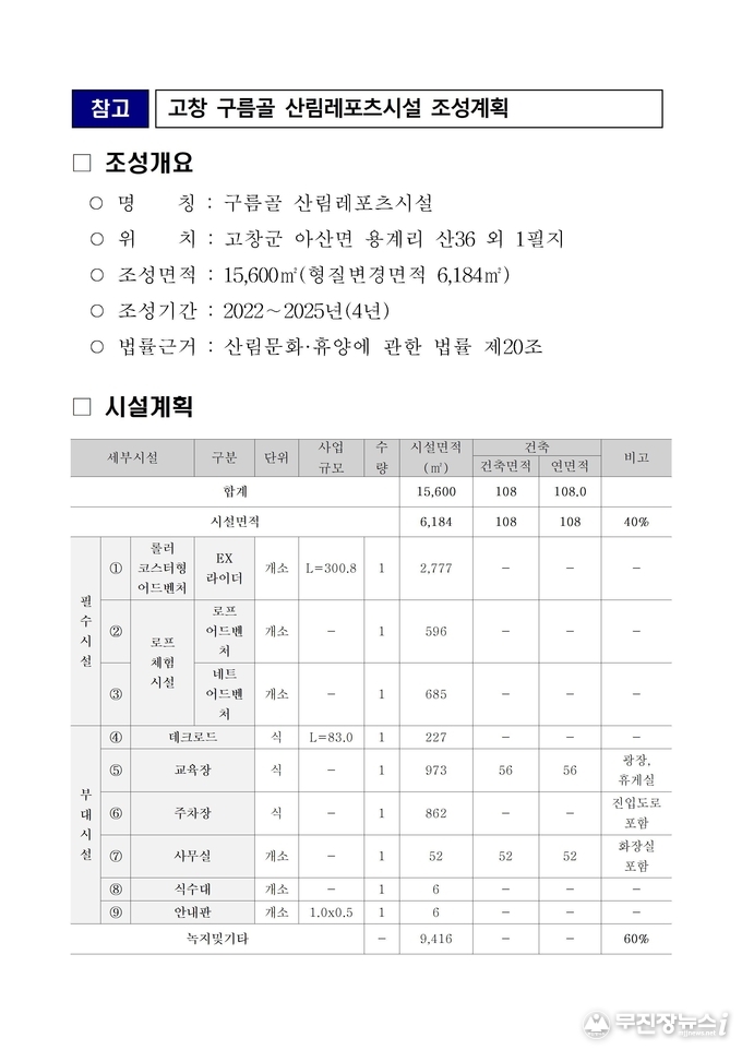 고창군 아산면 용계리 일원에 조성되는 구름골 산림레포츠시설은 총사업비 58억 원을 투입해 1.5ha 규모로 조성되며, 오는 2025년 말 완공을 목표로 하고 있다.