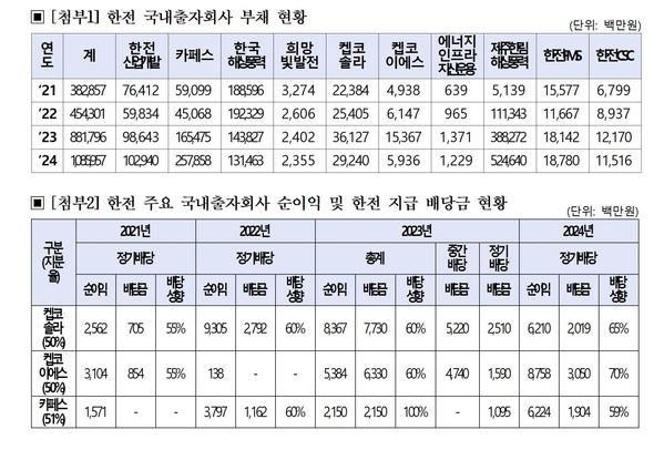 출자회사 배당금 확대에 대해 한전은 상법상 배당 한도보다 더 보수적으로, 전년도 당기순이익 한도 내에서 배당금을 산정하고 있다는 입장이다. 특히 카페스의 부채는 공사가 진행됨에 따라 매출로 전환될 예정인 ‘착한 부채’ 성격이라고 설명했다.