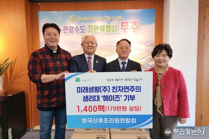 이번 기부는 한국산후조리원연합회(대표 이석범)를 통해 성사됐으며 총 50상자(1상자당 28팩, 총 1천4백 팩) 약 170만 원 상당의 여성용품은 무주군청소년상담복지센터 등 지역 청소년 관련 기관에 전달됐다. 해당 물품은 지역 내 한부모 및 다문화가정 청소년, 출산가정 등에 배부될 예정이다.