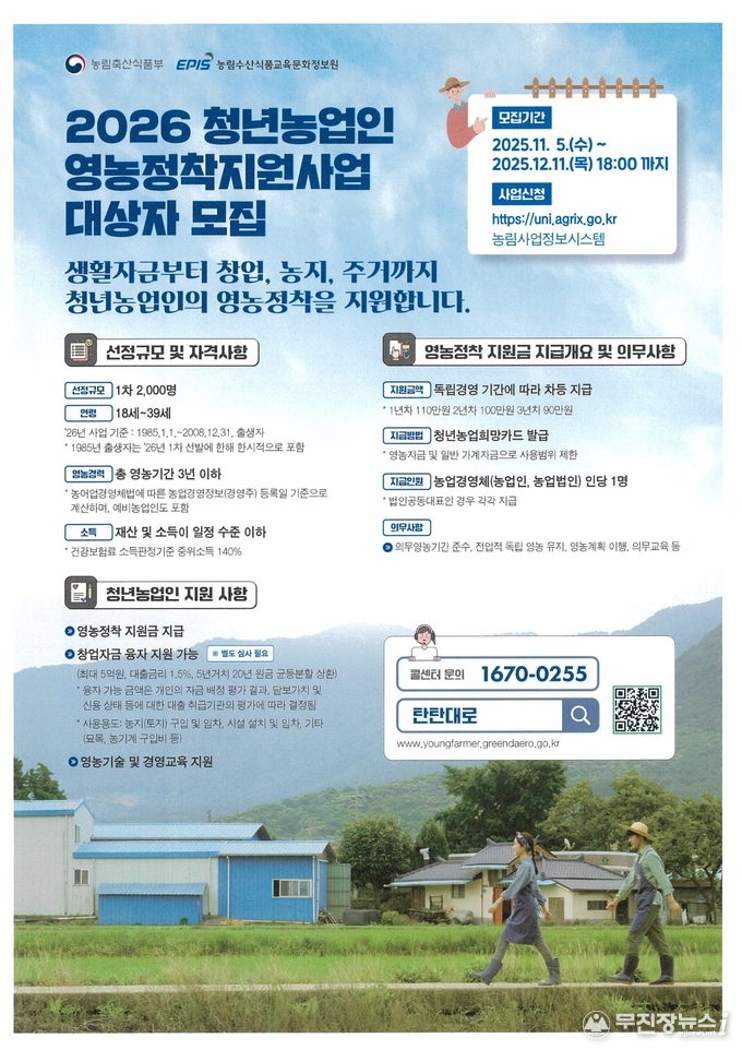 장수군은 농업의 미래를 이끌어갈 유망한 청년농업인을 육성하기 위해 ‘2026년 청년농업인 영농정착지원사업’ 신청을 오는 12월 11일까지 받는다고 밝혔다.
