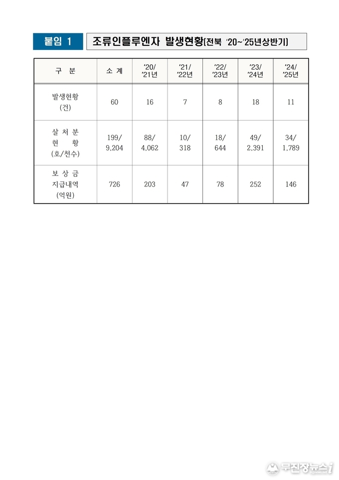 경제적 피해를 막기 위한 보상 체계도 병행 중이다. 최근 5년간 전북에서 AI로 살처분된 가금류는 920만 마리, 농가는 199호에 달하며, 보상금으로 총 726억 원이 지급됐다. 특히 2023~2024년 겨울철에는 12월에만 18건의 AI가 발생해 피해가 집중됐던 만큼, 도는 올해도 같은 시기를 고위험 기간으로 보고 모든 자원을 집중 투입하고 있다.