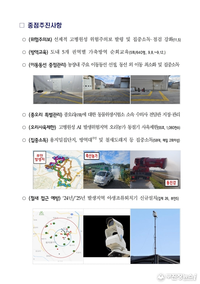 철새로 인한 AI 전파 차단에도 만전을 기하고 있다. 야생조류퇴치기 31개소를 신규 설치하고, 철새도래지 10개소와 수변 3㎞ 내 가금농가 102호에는 소독차량 58대를 투입해 집중 소독을 시행 중이다. ‘산란율 저하’나 ‘급격한 폐사’ 등 이상 징후가 있는 농가는 즉시 방역기관에 신고하도록 지속적인 홍보와 교육도 강화하고 있다.