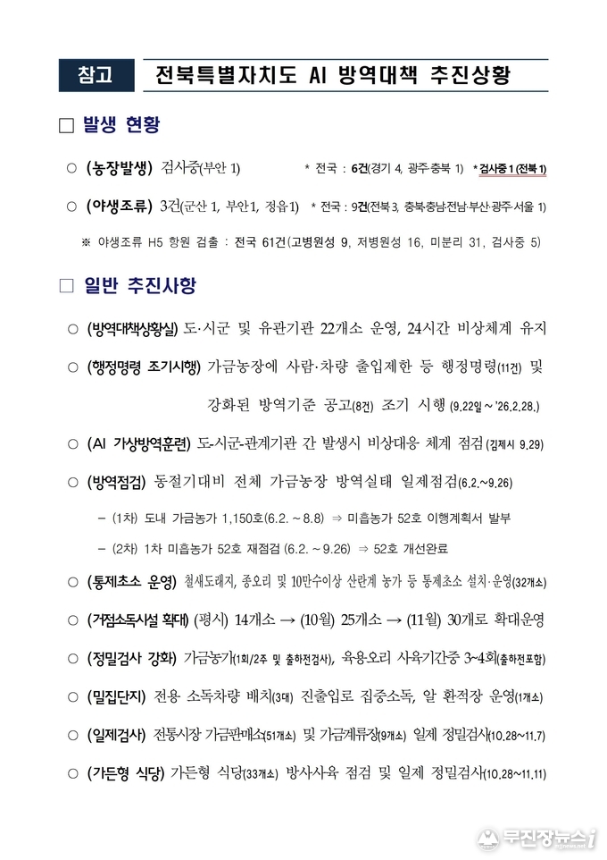 도는 AI 발생을 전제로 한 가상방역훈련도 실시한 바 있다. 지난 9월 김제시에서 진행된 훈련에서는 시군과 관계기관 간 발생 시 대응체계 점검을 통해 실전 대응력을 높였다. 도내 가든형 식당과 전통시장 가금판매소에 대한 방사 사육 실태조사 및 정밀검사를 진행하며, 바이러스 유입 가능성도 사전 차단하고 있다.