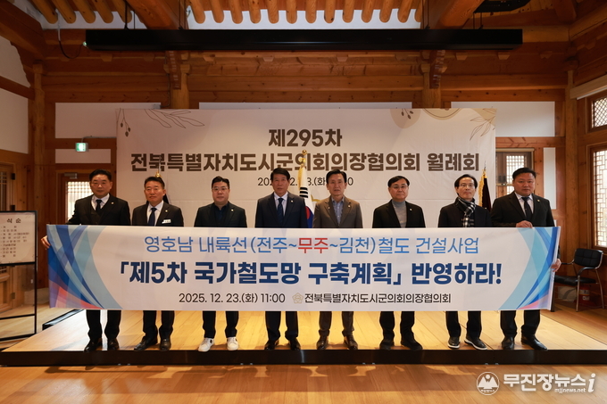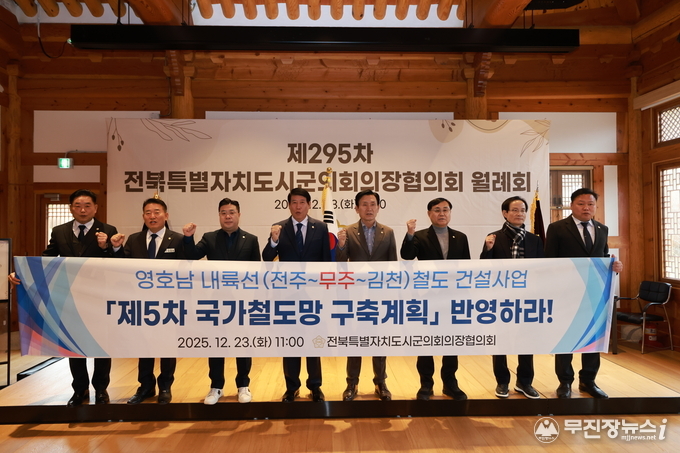 전북특별자치도시ㆍ군의회의장협의회(회장 남관우 전주시의회 의장)는 지난 23일 태권도원에서 열린 제295차 월례회에서 오광석 무주군의회 의장이 제안한 「영호남 내륙선(전주~김천) 철도 건설사업 제5차 국가철도망 구축계획 반영 촉구 건의안」을 만장일치로 채택했다.