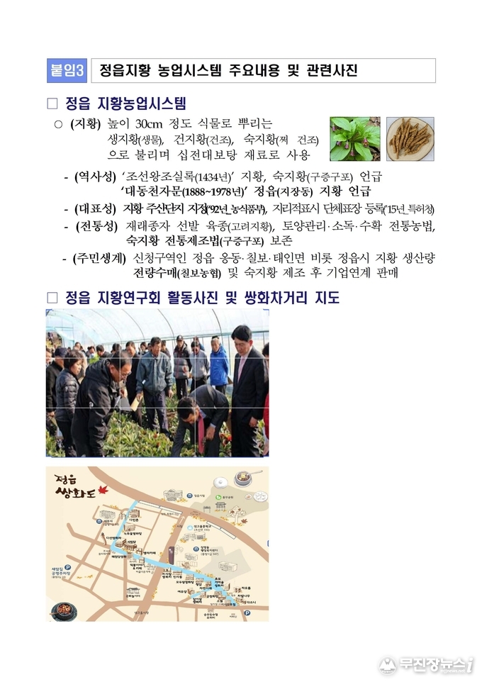 정읍 지황 농업시스템은 김해 진영 다락밭 감농업, 영주 풍기인삼농업 등과 함께 2025년도 국가중요농업유산 지정을 놓고 마지막까지 경합을 벌인 끝에 최종 선정됐다.