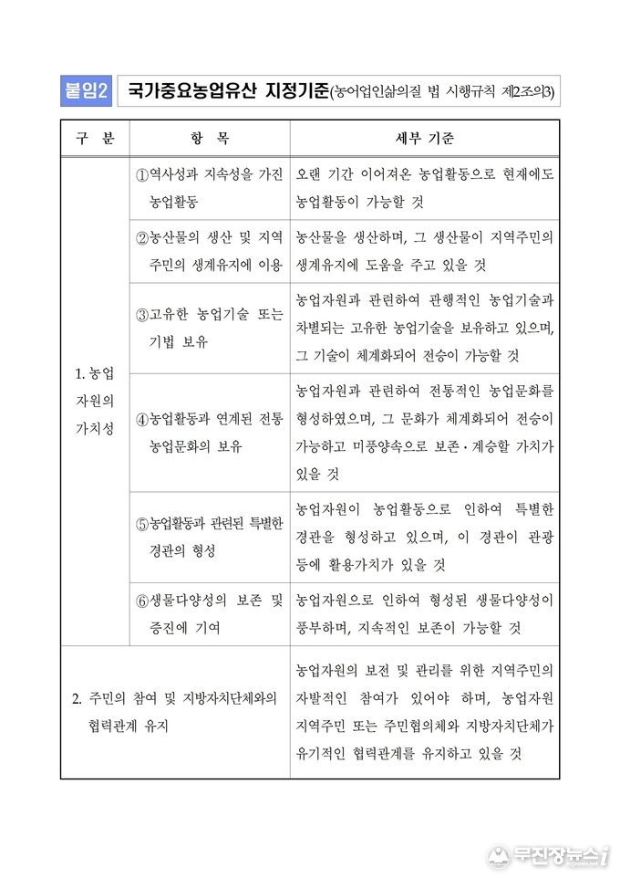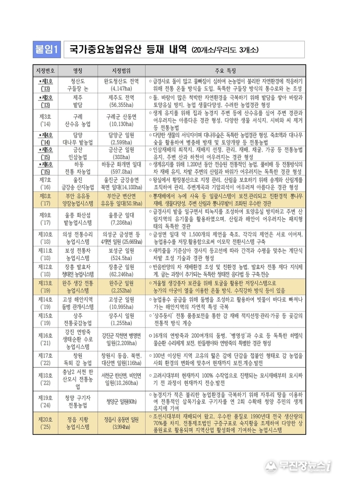 국가중요농업유산은 농업 활동을 통해 형성된 전통 농업자원을 체계적으로 보전·관리해 농촌의 다원적 가치를 지키고 지역사회의 지속가능한 발전에 활용하기 위한 제도로, 농림축산식품부가 2013년부터 운영하고 있다. 현재 청산도 구들장 논, 제주 밭담 등 전국 20곳이 지정돼 있다.