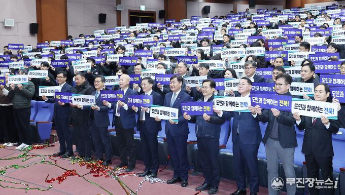 시무식 마무리에서는 전 직원이 '도민과 함께하는 전북'이라는 문구가 적힌 피켓을 일제히 들어 올렸다. 2026년 도정 사자성어 '여민유지(與民由之·백성과 더불어 함께한다)'의 의미를 되새기며 새해 도정에 대한 공감과 다짐을 함께했다.
