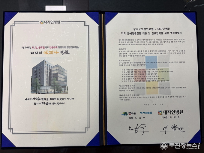 장수군은 대자인병원과 심뇌혈관질환 발생 시 신속하고 효과적인 대응을 위해 상호 진료협력 체계를 구축하는 ‘심뇌혈관질환 대응 진료협력 협약(MOU)’을 체결했다고 9일 밝혔다.