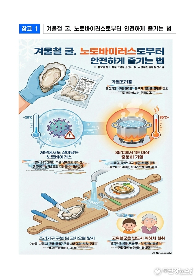 소비자는 굴 구입 시 포장지에 ‘가열조리용’ 문구가 있는지 반드시 확인해야 하며, 해당 제품은 생으로 섭취하지 말고 85℃ 이상에서 1분 이상 충분히 가열해 섭취해야 한다. 굴의 중심부까지 열이 전달되도록 익혀야 바이러스가 사멸한다.