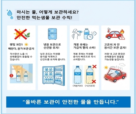 연구원은 먹는샘물은 직사광선을 피하고 서늘한 그늘에 보관해야 하며, 차량 내부에 장시간 방치하지 말고 개봉 후에는 가급적 빠르게 음용하는 것이 바람직하다고 당부했다.