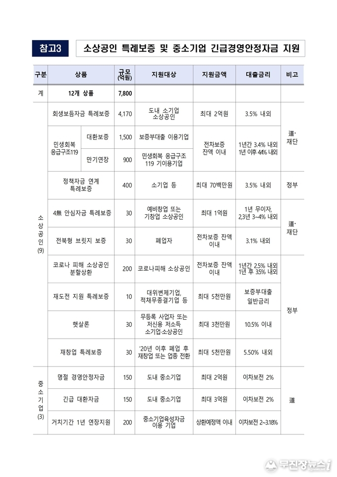 【소상공인 경영안정】 중소기업·소상공인 경영 부담 완화를 위한 맞춤형 금융 지원도 신속하게 추진된다. 소상공인을 대상으로 회생보듬자금 특례보증(4,170억원 규모) 등 9개 상품, 중소기업을 대상으로 명절 경영안정자금(150억) 등 3개 상품을 포함해 총 12개 상품 7,800억원 규모의 금융 지원을 시행한다. 특히 특례보증 지원 희망자에 대해서는 2월말까지 표준처리일수를 7일에서 3일로 단축해 적기에 지원할 방침이다.