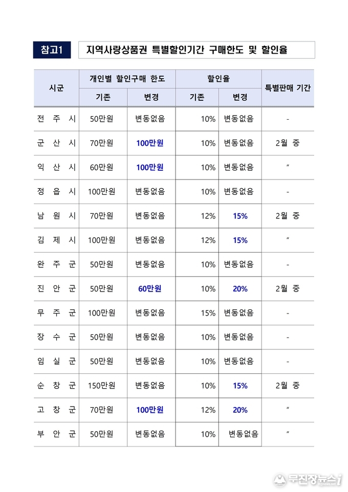 이와 함께 지역사랑상품권 개인별 할인구매 한도를 2월 중 군산·익산·고창 100만원, 진안 60만원까지 확대하고, 진안·고창 20%, 남원·김제·순창 15%까지 할인율을 상향해 지역 상권 매출 증대가 기대된다.