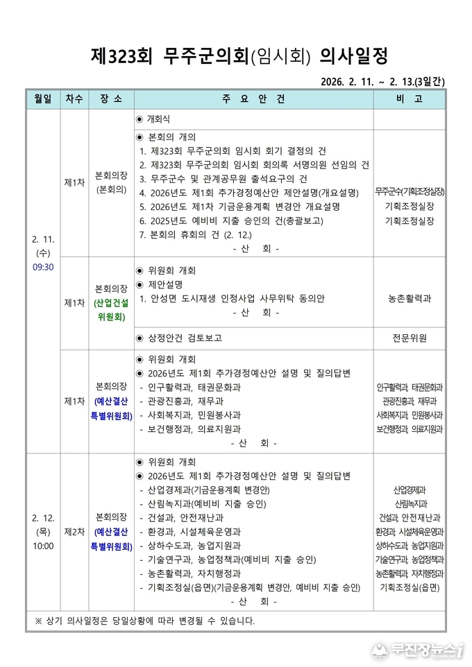 무주군의회(의장 오광석)는 2월 11일 제323회 임시회를 개회하고, 군민의 삶과 직결된 주요 안건에 대한 본격적인 심사에 들어갔다.
