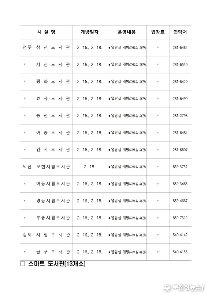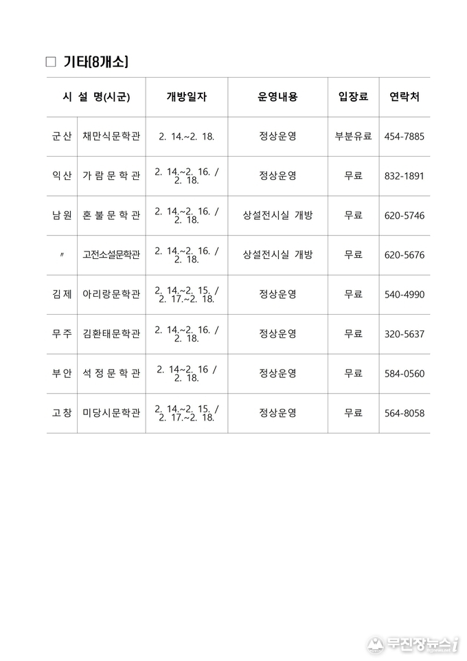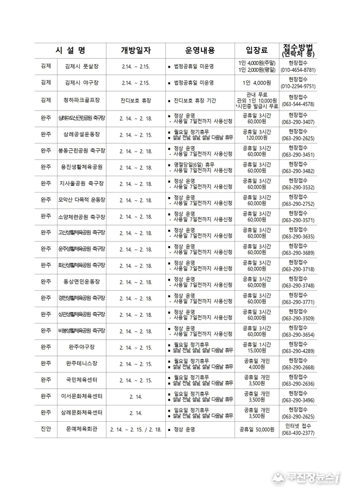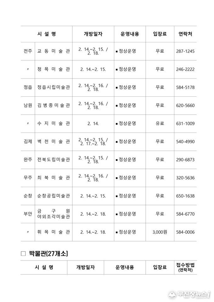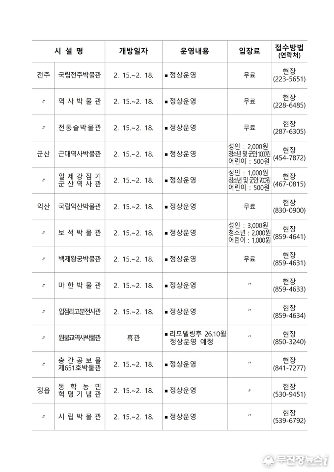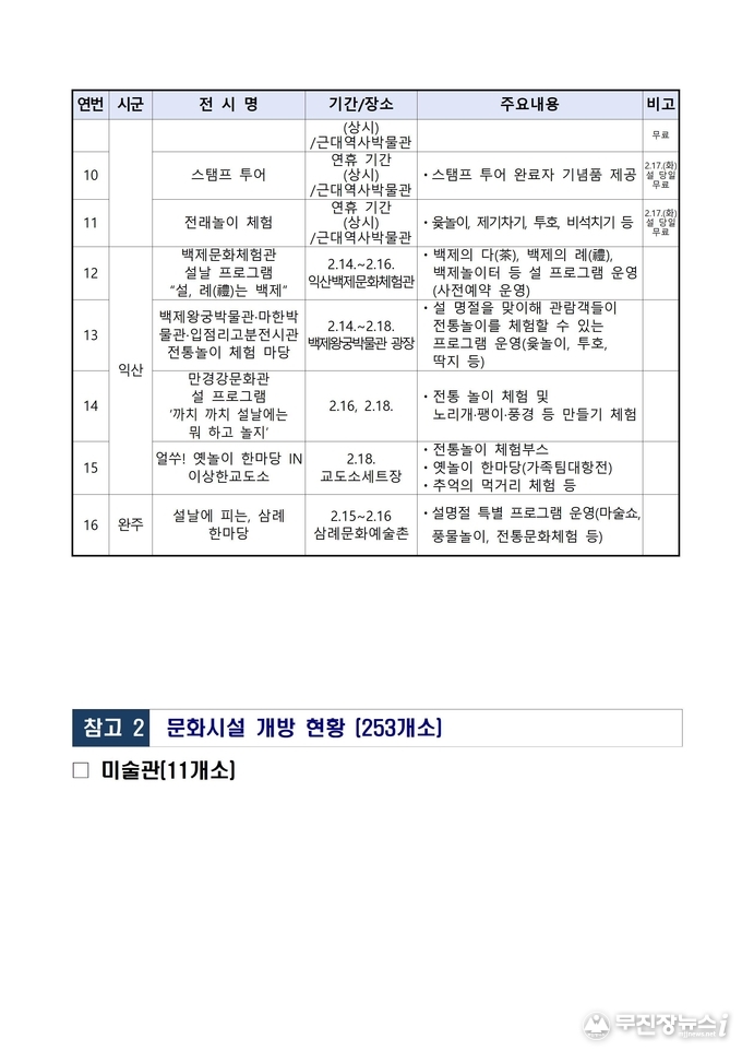 전북특별자치도가 올 설 연휴에 도내 문화시설 253곳을 개방한다. 박물관과 미술관, 도서관, 관광지, 체육시설이 고루 포함돼 도민과 귀성객, 관광객이 명절에도 다양한 문화공간을 이용할 수 있다. 개방 시설에서는 전시와 공연이 이어지고, 지역 곳곳에서는 전통과 현대가 어우러진 명절 행사가 펼쳐져 풍성한 볼거리와 즐길 거리를 제공한다.