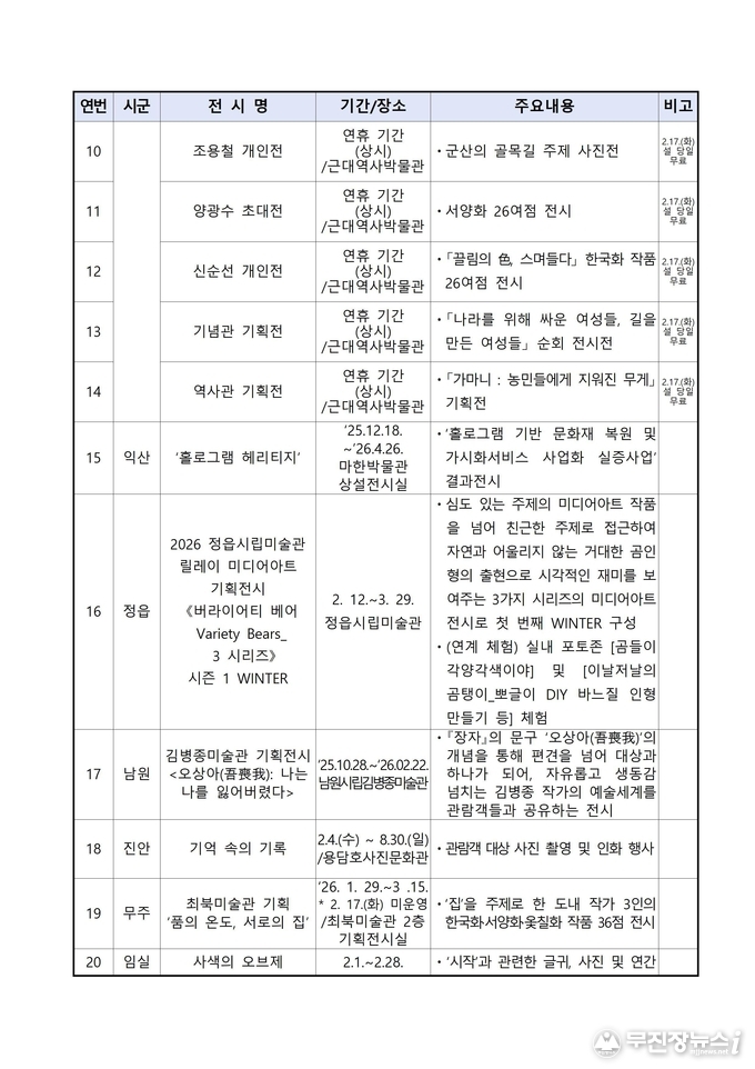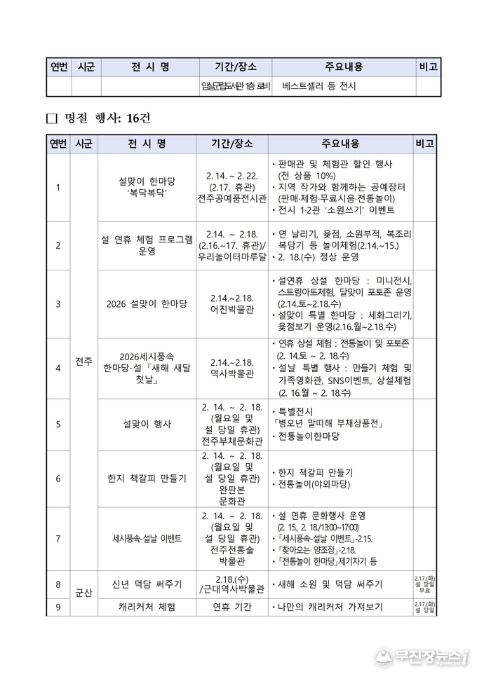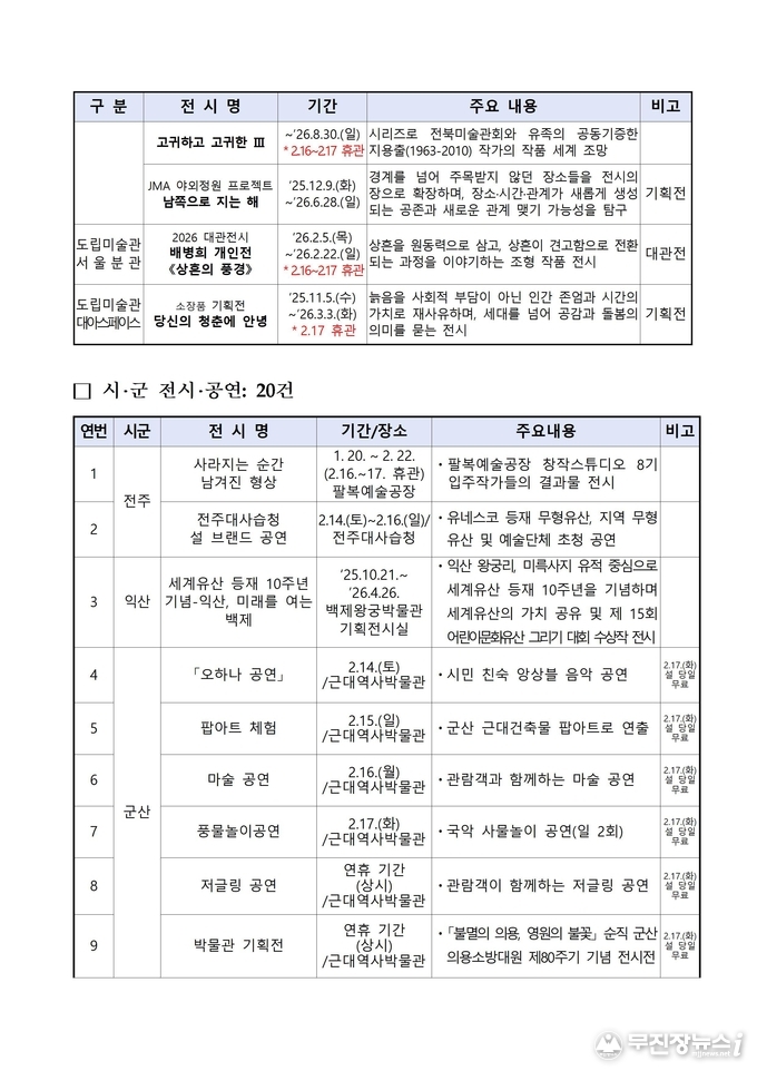 시군에서도 설 연휴를 맞아 전시와 공연이 이어져 전주 팔복예술공장 「사라지는 순간, 남겨진 형상」전과 전주대사습청 설 브랜드 공연, 익산 백제왕궁박물관 세계유산 등재 10주년 기념전, 마한박물관 ‘홀로그램 헤리티지’ 특별전이 관람객을 맞는다. 정읍시립미술관 「버라이어티 베어–WINTER」, 남원 김병종미술관 「오상아」전, 군산 근대역사박물관 공연·체험 프로그램 등 20여 건의 문화행사가 연휴 기간 발길을 이끈다.