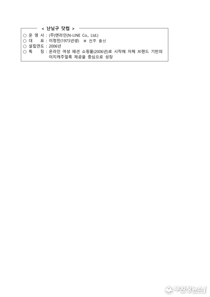 ㈜엔라인은 2006년 설립된 패션·라이프스타일 커머스 기업으로, 온라인 여성 패션 쇼핑몰 ‘난닝구닷컴’을 운영하며 전북 지역을 중심으로 사회공헌 활동을 이어오고 있다.