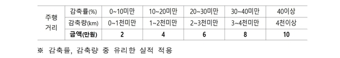인센티브는 주행거리 감축 실적에 따라 최소 2만원에서 최대 10만원까지 차등 지급되며, 감축률과 감축량 중 참여자에게 유리한 기준이 적용된다.