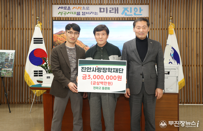 이에 전춘성 진안사랑장학재단 이사장은 “지역인재 양성을 위해 따뜻한 마음을 모아주신 전라고 동문회에 깊이 감사 드린다”라며, “보내주신 장학금은 진안의 학생들이 자부심을 갖고 학업에 전념할 수 있는 환경을 만드는 데 소중히 사용하겠다”라고 화답했다.