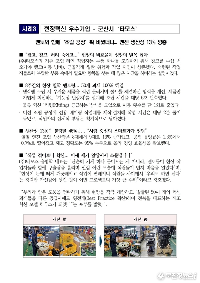 승병학 타모스 대표는 “멘토들이 현장 작업자들과 함께 구슬땀을 흘리며 진심 어린 모습을 보여주니 직원들이 먼저 마음을 열었다”며 “현장이 눈에 띄게 깨끗해지고 작업이 편해지면서 ‘우리도 하면 된다’는 자신감이 생긴 것이 가장 큰 수확”이라고 설명했다.