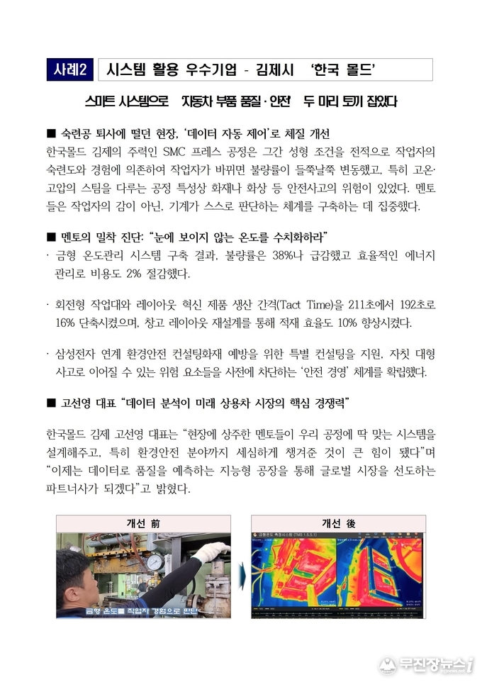 김제시 자동차 부품업체 ‘한국몰드 김제’는 시스템 활용의 모범 사례로 꼽힌다. 이 회사는 고온·고압 스팀을 다루는 SMC 프레스 공정에서 성형 조건을 전적으로 작업자 경험에 의존해 불량률 변동과 안전사고 위험이 상존했다.