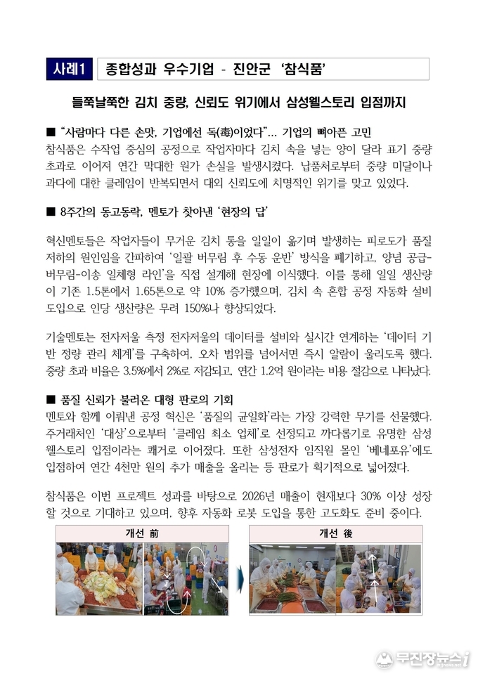 이재우 참식품 대표는 “공정 고도화와 판로 확대 성과를 동시에 얻었다”며 “올해 매출이 30% 이상 성장할 것으로 기대하고 있으며, 향후 자동화 로봇 도입을 통한 추가 고도화를 단계적으로 추진하겠다”고 밝혔다.