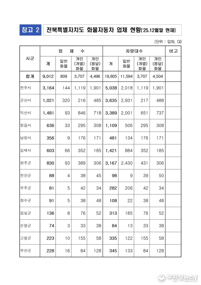 한편, 2025년 12월 말 기준 도내 화물자동차 운송사업은 총 9,012개 업체, 1만9,805대 차량 규모로 운영되고 있다.