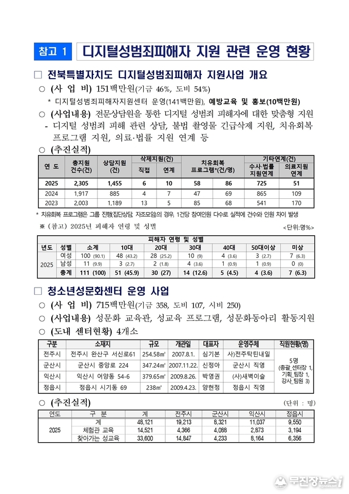 디지털 성범죄 피해 상담 및 지원은 전북특별자치도 디지털성범죄피해자지원센터(☎063-717-1366) 또는 도 여성가족과(☎063-280-2524)를 통해 안내받을 수 있다.