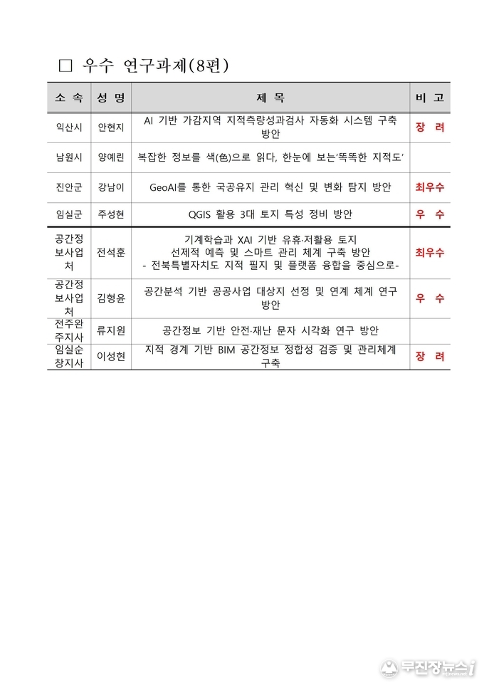 우수상은 임실군 주성현 주무관의 ‘QGIS 활용 3대 토지 특성 정비 방안’과 LX전북본부 김형윤 과장의 ‘공간분석 기반 공공사업 대상지 선정 및 연계 체계 연구’가 선정됐다. 두 연구는 토지정보 정비의 정확도를 높이고 공공사업 입지 선정 과정의 과학적 근거를 강화하는 등 실무 활용성이 뛰어난 것으로 평가됐다.