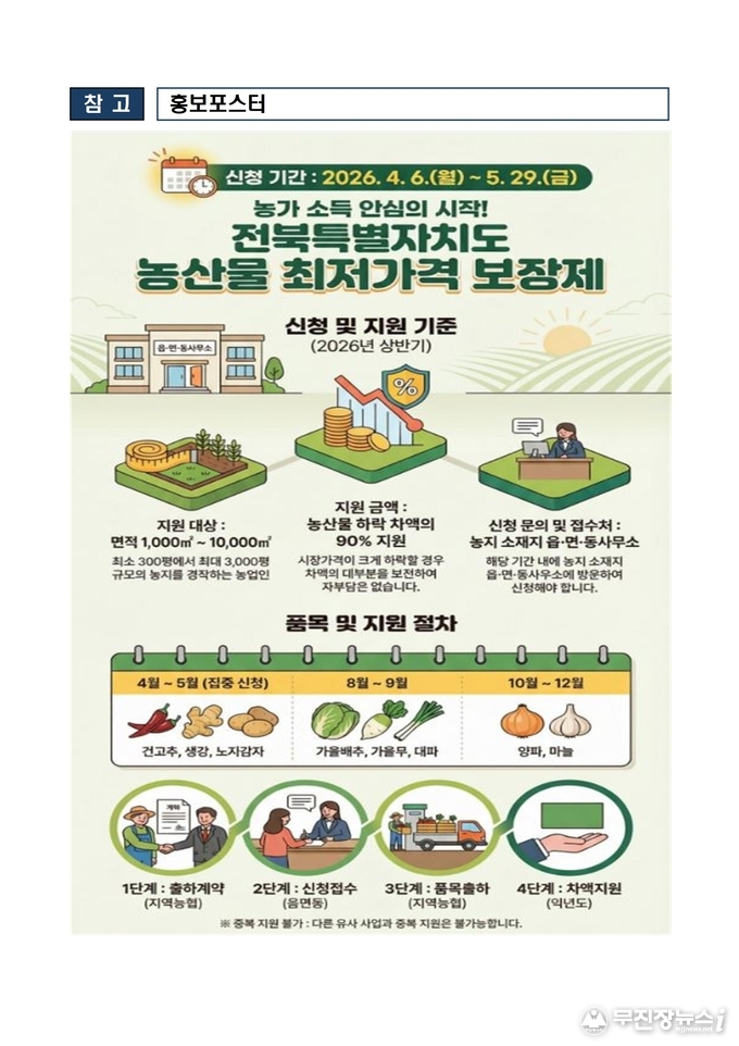 전북특별자치도는 가격 변동성이 큰 농산물에 대한 경영안정 지원을 위해 ‘2026년 주요농산물 가격안정 지원사업’ 신청을 4월 6일부터 오는 5월 29일까지 접수한다.
