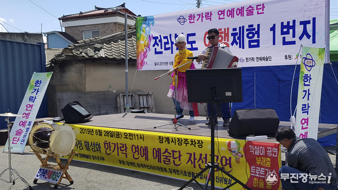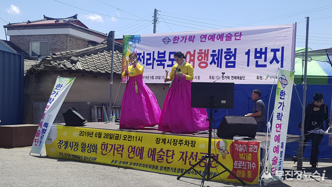 지난 28일 장계 시장에서 펼쳐진 행사는 한가락연예예술단원 12팀(30명)의 민요와 판소리, 각설이, 마술, 아코디언, 해금 연주 등 다채로운 공연과 주민들의 노래자랑이 진행됐다.