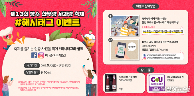 이벤트 참여 방법은 축제 현장을 배경으로 찍은 인증샷을 자신의 페이스북과 인스타그램 등 SNS에 올리고 필수해시태그(#한우랑사과랑축제, #장수군, #가을맛집)해 게시한 한 뒤