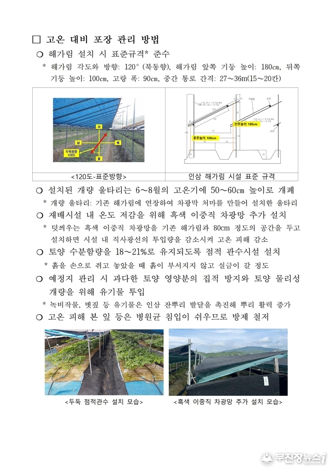 인삼 해가림 시설 안 온도는 시설을 표준규격보다 낮게 설치했을 때, 고랑 폭이 좁을 때, 36m 이상 길게 설치해 환기가 제대로 이뤄지지 않을 때 올라간다.