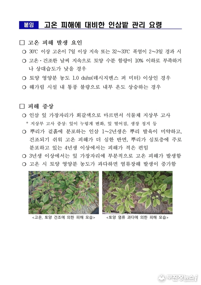 농촌진흥청은 인삼 고온 피해 예방법을 안내하는 ‘고온 대비 인삼 재배포장 관리 방법’ 홍보 전단을 전국 인삼농협에 제공했다. 이와 함께 폭염 피해 상황을 수시 확인해 피해 농가를 대상으로 기술을 지원할 계획이다.