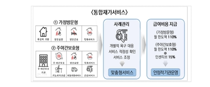 ○ 하나의 기관(주·야간보호 또는 방문간호)에서 수급자의 욕구‧상태에 따라 다양한 재가서비스(주·야간보호, 방문요양, 목욕, 간호)를 전문인력(간호사, 물리치료사, 사회복지사, 요양보호사)이 복합적으로 제공하는 서비스