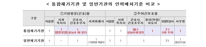 (인력기준) 서비스유형별 아래 기관 내 해당 직종 각 1인 필수(추가) 배치