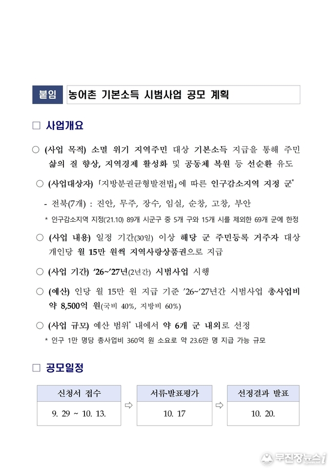 전북특별자치도는 농림축산식품부의 농어촌 기본소득 시범사업 공모에 도내 인구감소지역 7개 군 전체가 신청을 마쳤다고 14일 밝혔다.