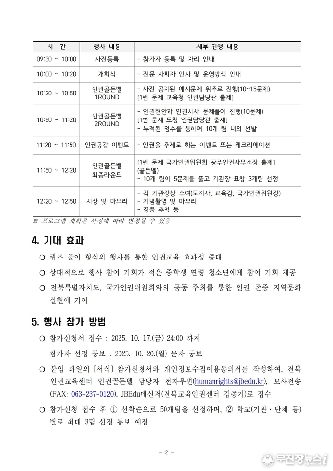 한편 이 행사는 오는 24~25일 전북특별자치도가 주최하는 ‘인권문화축제’의 일환으로 열리며, 자세한 사항은 전북교육인권센터(063-237-0356)로 문의하면 된다.