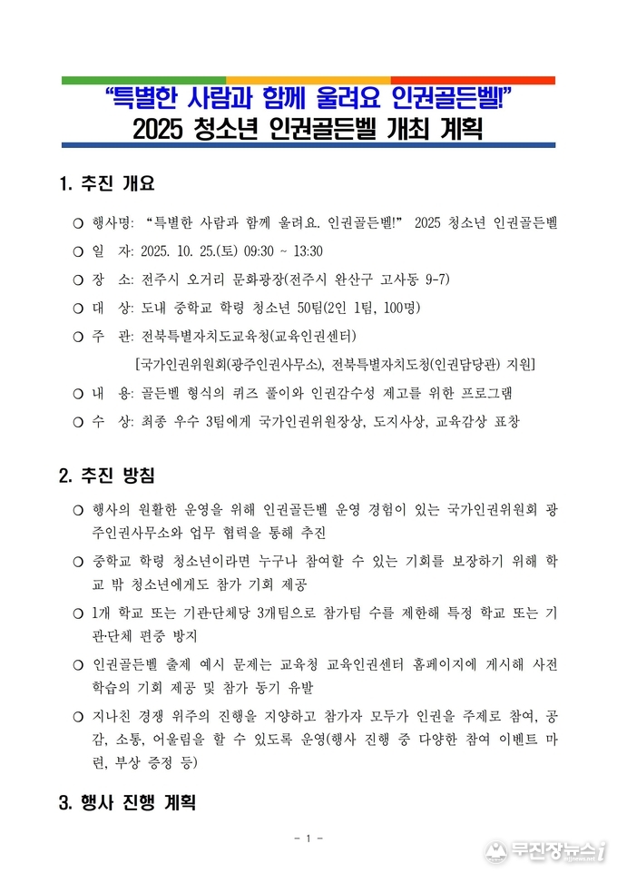 전북특별자치도교육청은 국가인권위원회, 전북특별자치도청과 함께 ‘특별한 사람과 함께 울려요. 인권골든벨!’이라는 주제로 오는 25일 ‘2025 청소년 인권골든벨’을 개최한다고 14일 밝혔다.