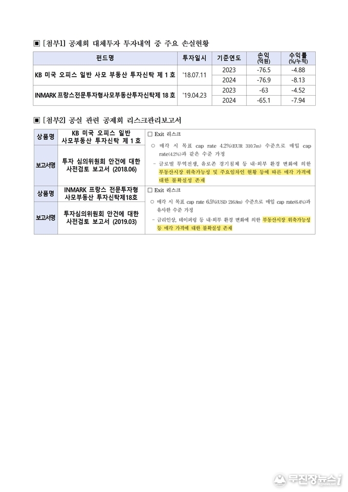 더욱이 공제회는 투자결정 단계에서 이미 이러한 자금회수 리스크를 인지했음에도 투자를 강행한 것으로 나타났다. 공제회의 리스크관리보고서에 따르면, 두 상품 모두 “부동산시장 위축가능성 등으로 매각 가격에 대한 불확실성이 존재”한다는 우려가 있었으며, 투자심의위원회에서도 관련 지적이 있었다.