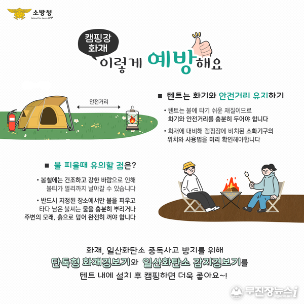 진안소방서 관계자는 “캠핑의 즐거움은 안전이 뒷받침될 때 더욱 커진다”며 “군민 여러분께서는 캠핑 전 안전수칙을 꼼꼼히 확인하고, 화재와 사고 없는 안전한 캠핑을 즐기시기 바란다”고 말했다.