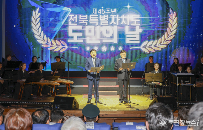 행사는 도립국악원 관현악단의 개막공연 ‘멋으로 사는 세상’으로 문을 열었다. 이어 도민헌장은 김관영 전북특별자치도지사와 문승우 전북특별자치도의회 의장이 함께 교차 낭독하며, 전북도민의 자긍심과 공동체 정신을 함께 선언했다.