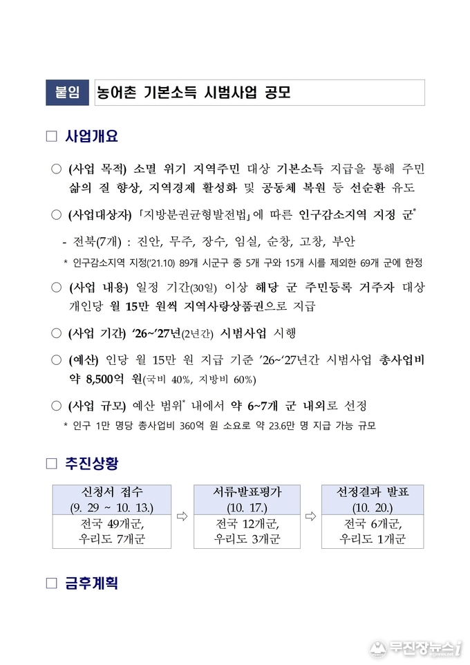 이번 공모는 이달 13일 전국 인구감소지역 69개 군을 대상으로 진행됐으며, 전북 7개 군을 포함해 10개 광역시·도 49개 군이 신청해 8.2대 1의 높은 경쟁률을 나타냈다. 16일 1차 서류심사에서 순창, 진안, 장수 등 3개 군을 포함한 12개 군이 통과했고, 17일 발표 평가를 거쳐 20일 최종 7개 군으로 압축됐다.