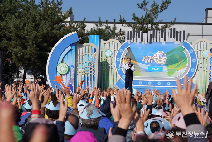 장수군 홍보대사인 최재명 등 초청가수 공연을 비롯한 군민과 상인이 함께 어우러진 노래 축제장수군은 전통시장 활성화를 위한 ‘와글와글 시장가요제’가 20일 장수시장 특설무대에서 성황리에 열렸다고 밝혔다.